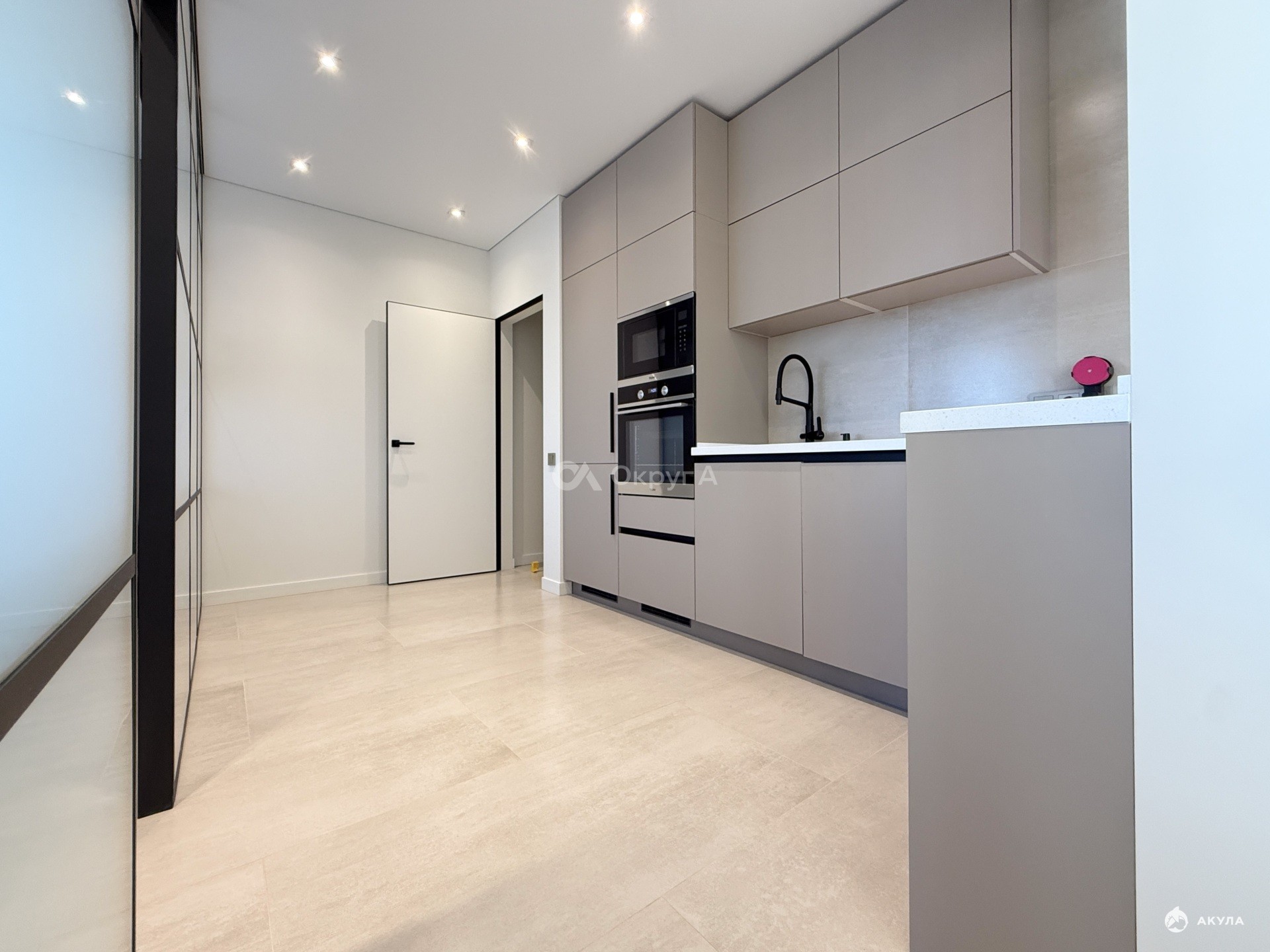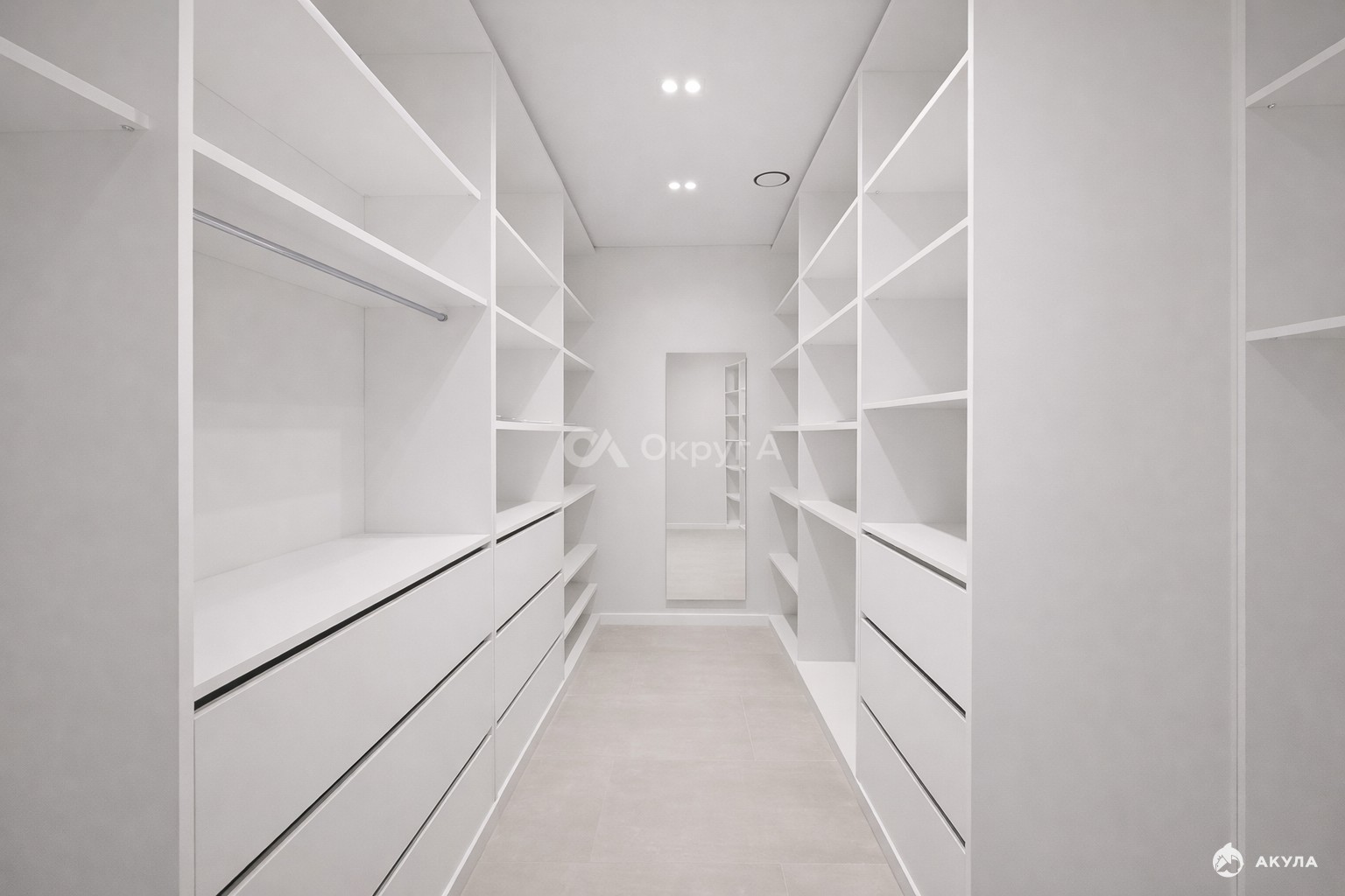 Потолок — встроенное точечное освещение без лишних элементов.