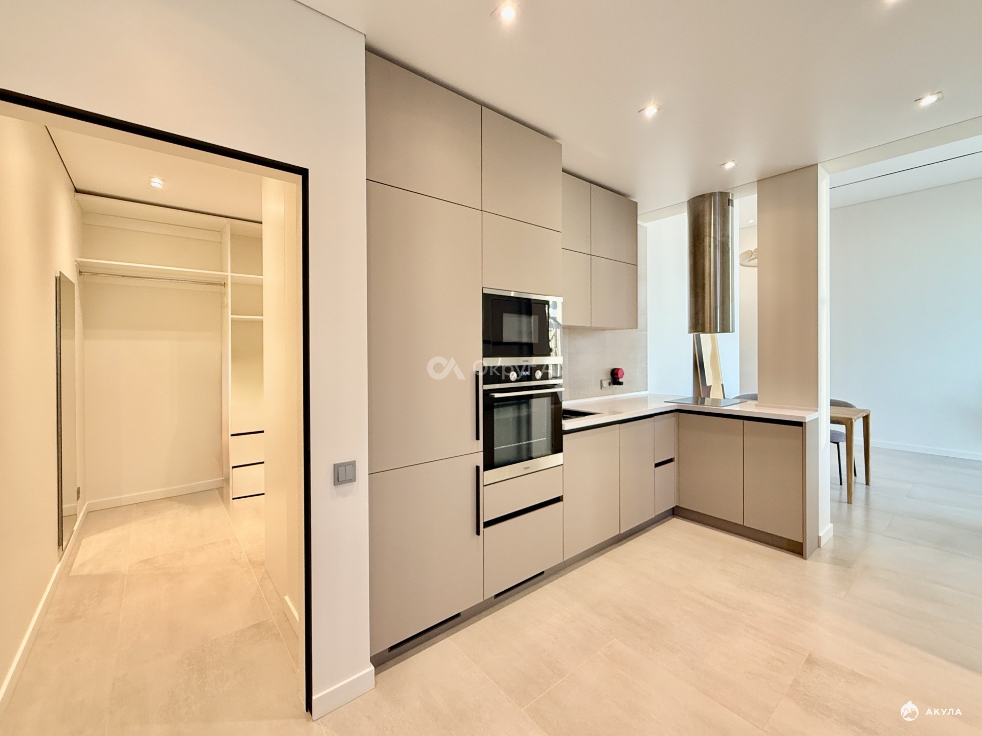 Кухня интегрирована в общий объём: Встроенная техника, Минималистичные фасады, Интегрированная вытяжка, Подсветка рабочей зоны, Чёткая геометрия линий.