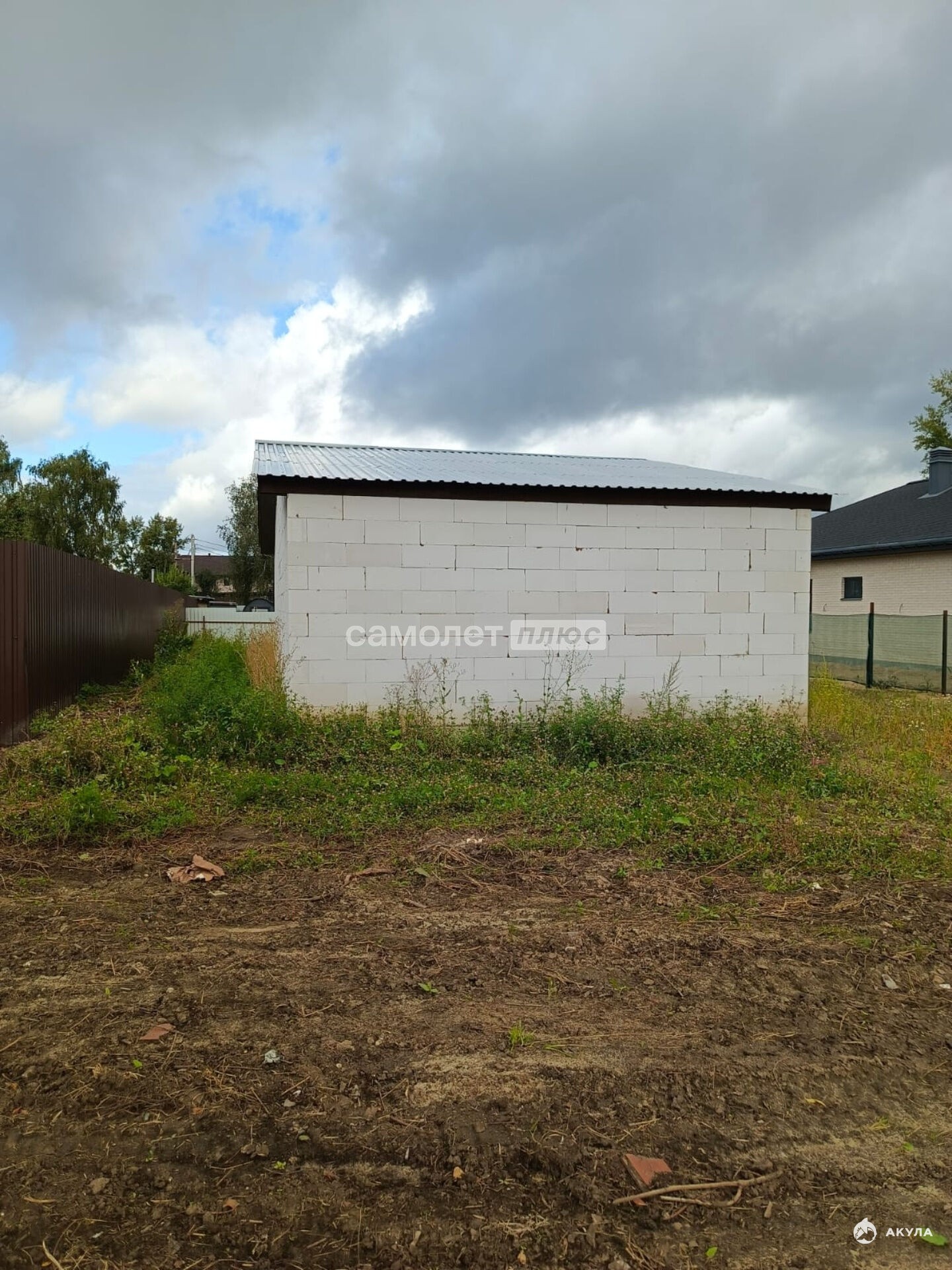 На участке расположен дом из пеноблоков площадью 66, 2 м², построенный на ленточном фундаменте.Газ по периметру, свет не заведён.